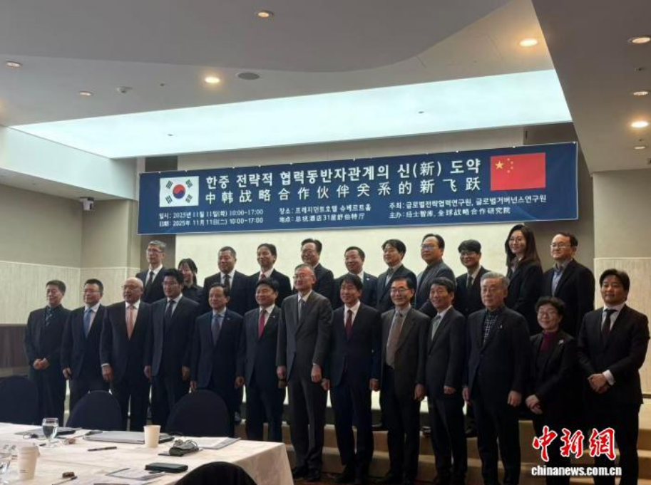 11月11日,“深化中韩战略合作伙伴关系国际论坛”在韩国首尔举行。图为活动合影。刘思宁 摄 中新网首尔11月11日电 (刘旭 刘思宁)11日,“深化中韩战略合作伙伴关系国际论坛”在韩国首尔举行。 本次论坛由韩国全球战略合作研究院和中国经士智库共同主办,旨在围绕外交安全、经济安保、社会文化交流等议题进行深入讨论,并就两国未来合作方向进行交流。中国驻韩国大使戴兵、韩国驻中国大使卢载宪、韩国国会韩中议员联盟事务总长洪起元、韩国全球战略合作研究院院长黄载皓等现场或视频致辞。30余名中韩专家学者出席论坛,10余家媒体现场采访。 戴兵在致辞中指出,习近平主席来韩出席APEC会议并进行国事访问取得圆满成功,引领亚太开放合作、开辟中韩关系新局面,希望中韩双方落实好两国元首重要共识,深化认知与互信,开拓互利合作新局,提升国民友好感情,妥处矛盾分歧,推动中韩关系行稳致远。 卢载宪在视频致辞中表示,自1992年建交以来的33年间,韩中两国在各个领域都取得了令人瞩目的发展。两国共同创造的成果超越了单纯的合作范畴,为携手应对全球变局、推动可持续发展构筑了坚实根基。 黄载皓表示,APEC会议期间举行的韩中元首会谈为两国关系注入了新的动力,当下正是深入探讨韩中关系未来发展的关键时期,期待此次专家对话为两国关系发展提供务实可行的思路和建议。 当天会议围绕“中韩首脑会谈的成果与意义”“朝鲜半岛及周边局势的变化与展望”“中韩关系发展方向与政策建议”等主题展开讨论。与会专家普遍认为,中韩两国在民间交流、地区稳定与经贸合作等领域仍具广阔合作空间,未来可望取得更多务实成果。 |